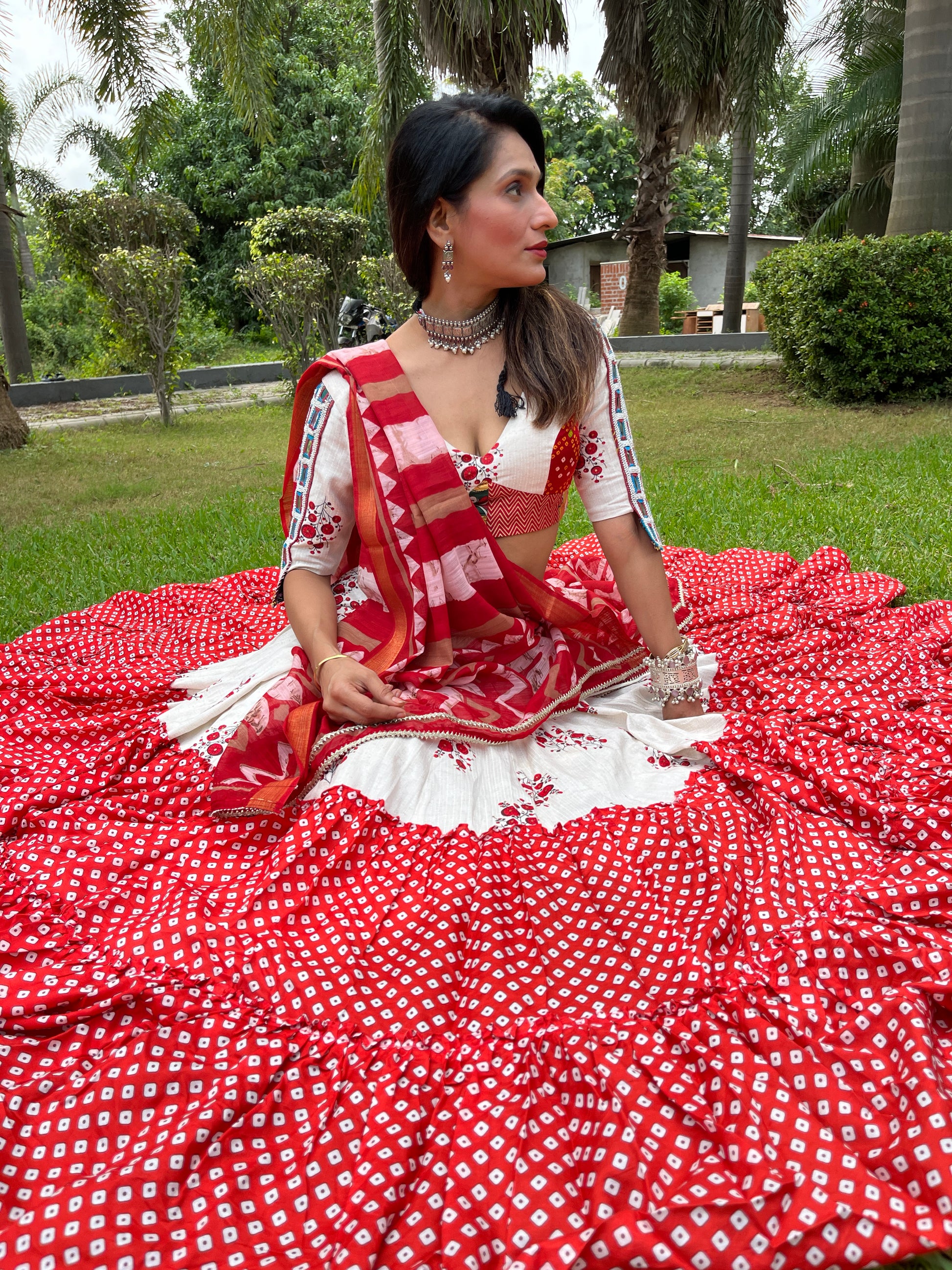 Ivory & Red Printed Lehenga Set with Patchwork Blouse